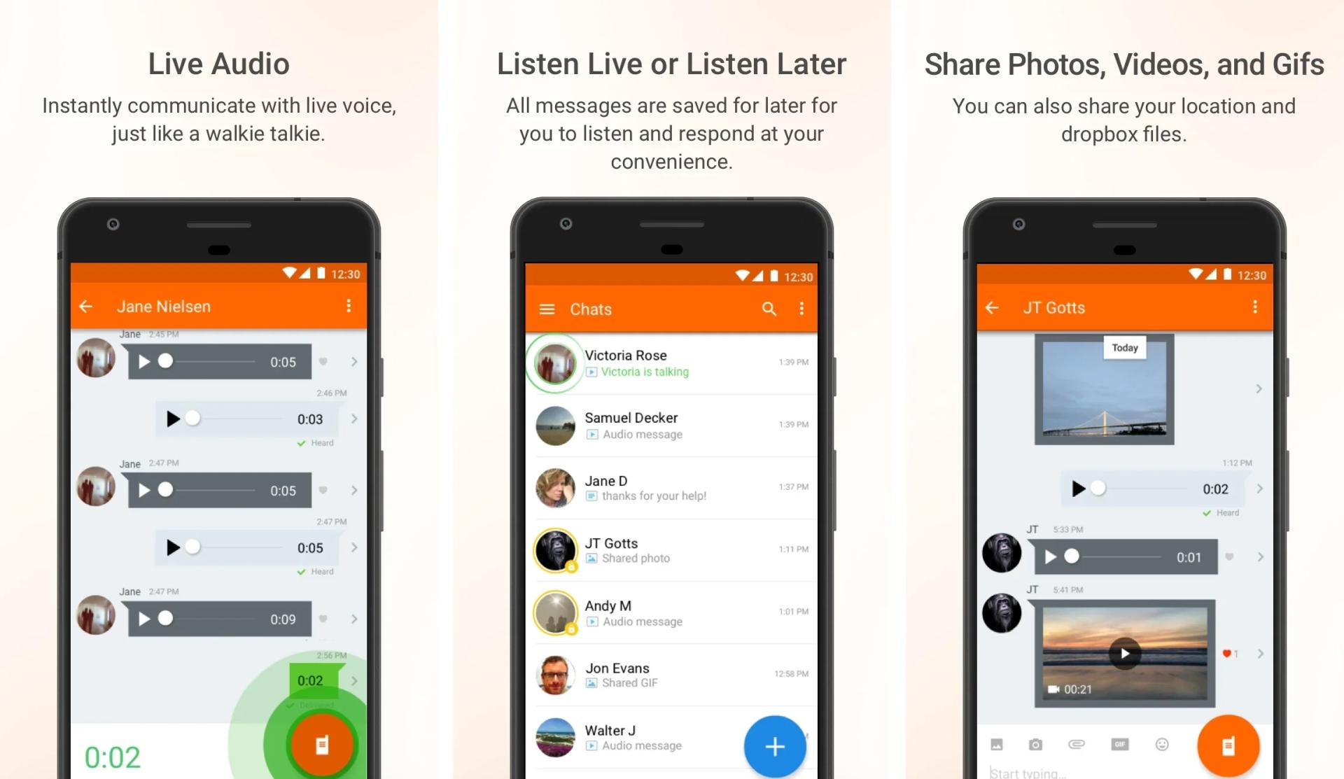 - Voxer lets you transmit live audio, and use it like a walkie talkie but all messages are saved for future access.