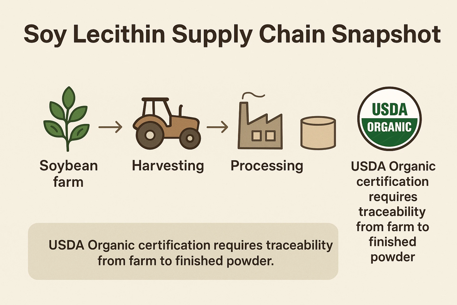 - Certifications – Assurance of USDA Certified Organic Soy Lecithin Powder and Non-GMO compliance.
