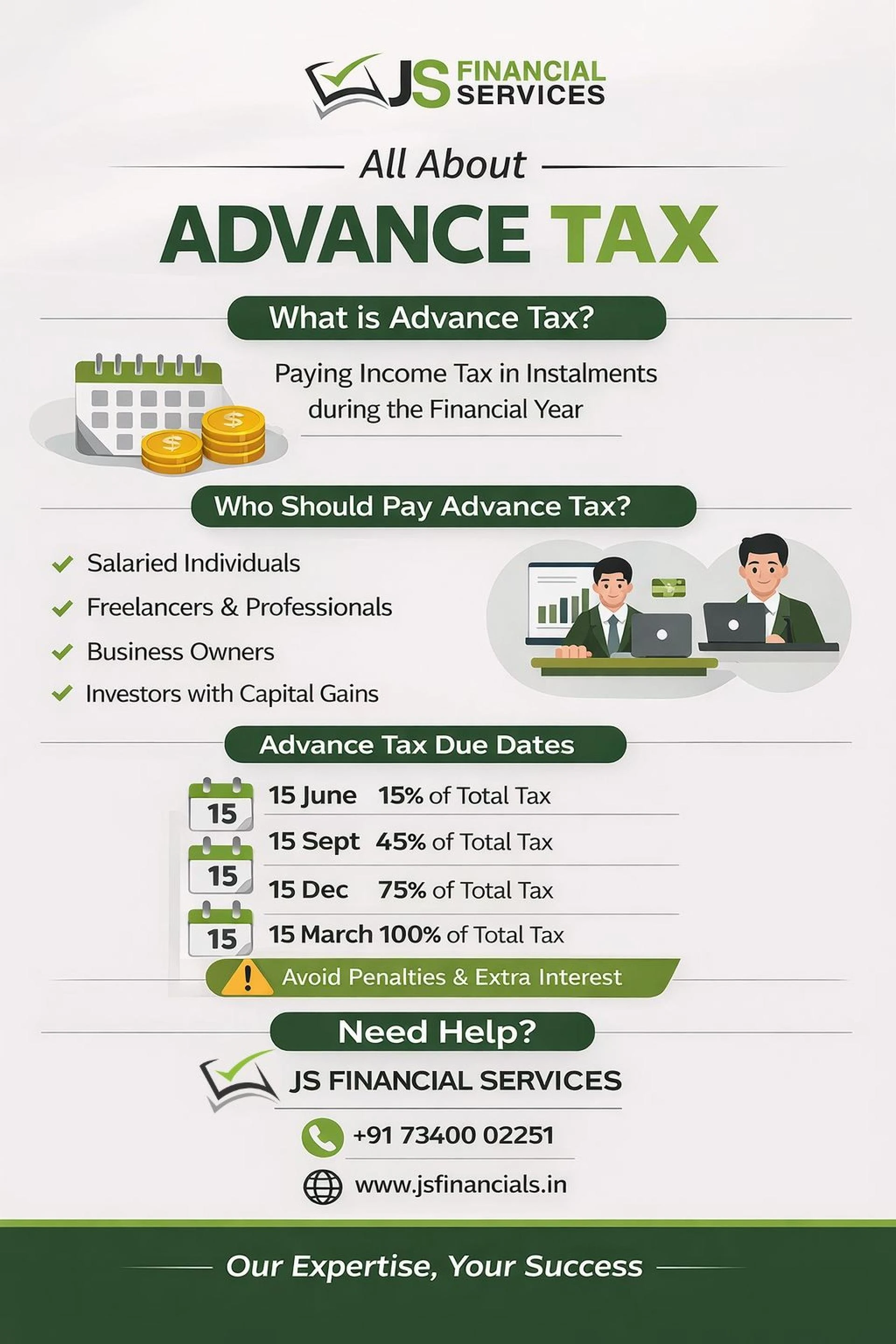 Contact JS Financial ServicesIf you need assistance with advance tax calculation or filing, feel free to contact us.