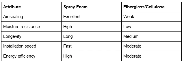 Traditional materials such as fiberglass and cellulose often leave gaps and compress over time. Spray foam forms a continuous barrier and maintains performance.