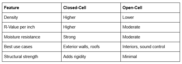 Project goals, building materials, and moisture conditions guide the choice between closed-cell and open-cell foam. Closed-cell works well where strength and moisture resistance matter, while open-cell suits interior spaces and sound control.
