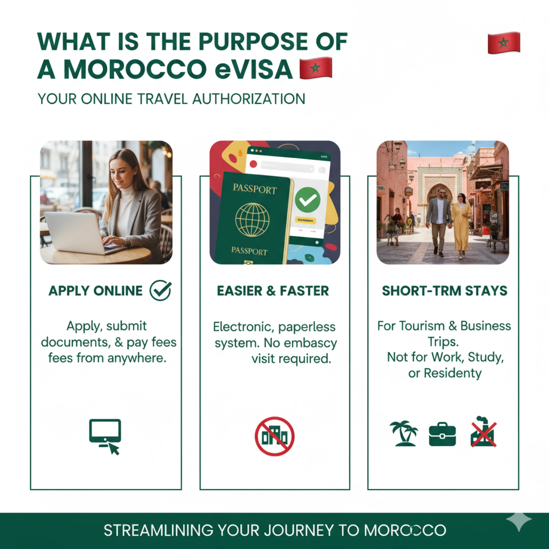 - The eVisa is primarily intended for short-term stays, such as tourism or business trips. It is not designed for long-term residence, work, or study in Morocco.