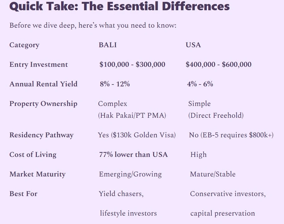 Picture this: You're standing at a crossroads in your investment journey. To your left, the turquoise waters of Bali lap against volcanic black sand beaches, where $200,000 buys you a villa with a private pool and 10% annual returns. To your right, the skyline of an American city gleams with stability, where $500,000 secures predictable 5% yields and unshakeable property rights.