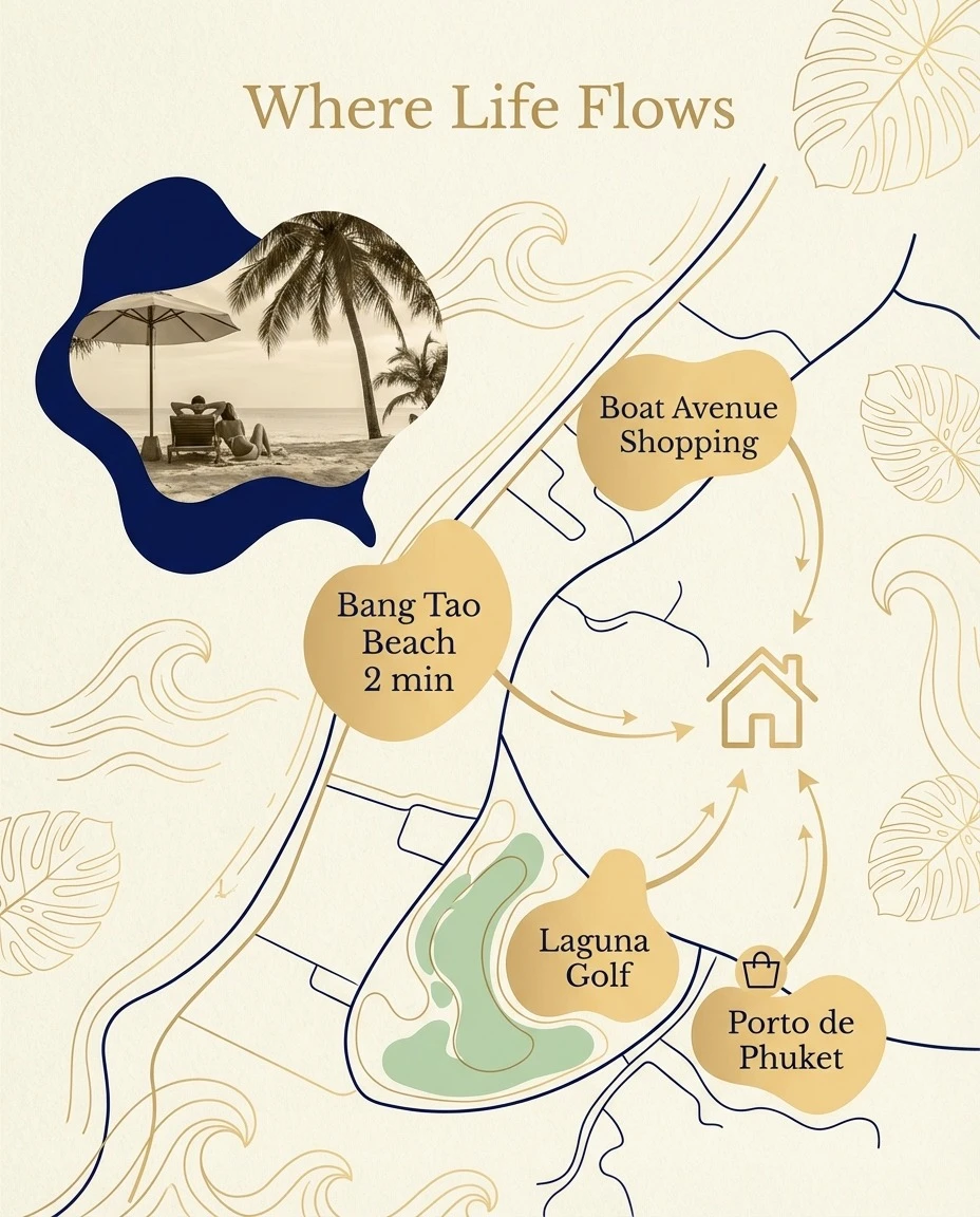 The Zero Bang Tao Phuket is a residential development in the Cherngtalay area near Bang Tao Beach, with marketing materials positioning it as a low-density project in a neighborhood that has seen rapid tourism and residential growth. The area sits a short drive from Bang Tao Beach and the integrated Laguna Phuket resort complex, which combines hotels, villas, golf and dining, and is close to community facilities such as Boat Avenue and Porto de Phuket. These lifestyle hubs have become key anchors for long-stay visitors, homeowners and digital professionals who prefer the northwest coast to more traditional resort zones in southern Phuket.