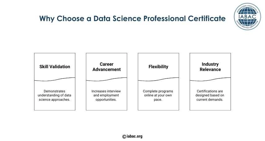 Your career stage, objectives, and financial constraints will determine which data science professional certificate in the USA is appropriate for you. Google and IBM login information is great for beginners. Stanford, MIT, and Harvard are outstanding choices for anyone looking for prestige. The IABAC Data Science Certificate is an excellent option if you want industry relevance and worldwide recognition.
