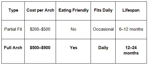 Full-arch sets tend to last longer between replacements.