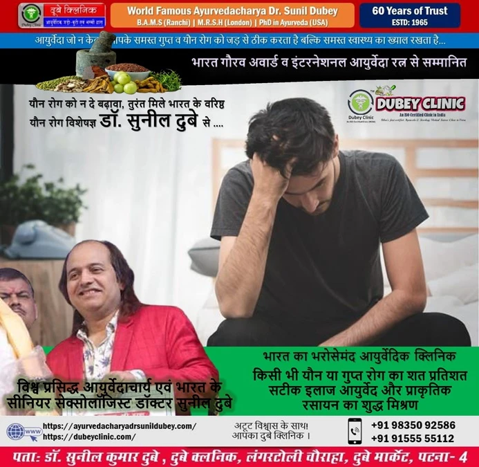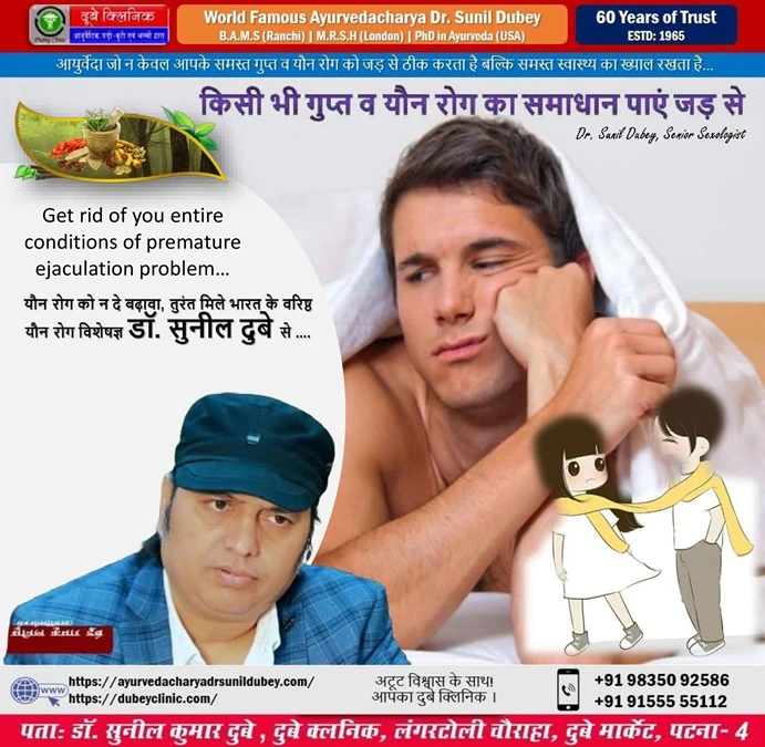 विश्व प्रसिद्ध आयुर्वेदाचार्य डॉ. सुनील दुबे, जो पटना में सर्वश्रेष्ठ सेक्सोलॉजिस्ट डॉक्टर हैं, कहते हैं कि शीघ्रपतन एक सामान्य स्थिति है, जहाँ व्यक्ति को महिला साथी के साथ बिस्तर पर अधिक समय तक रहने में समस्या होती है, जबकि उसका महिला साथी इस यौन क्रियाकलाप से असंतुष्टि की भावना से जूझ सकती है। आमतौर पर, शीघ्रपतन यौन प्रतिक्रिया चक्र को पूरा करता है, लेकिन यह एक उचित संभोग स्थापित नहीं करता है जहाँ दोनों भागीदारों को एक ही समय में संतुष्टि मिलती है। आज का सत्र पूर्णतः शीघ्रपतन के कारणों, लक्षणों, उत्तम आयुर्वेदिक उपचार योजना और निदान पर आधारित है। यह निश्चित ही उनलोगो के लिए ज्यादा फायदेमंद होगा, जो वाकई में पुरुषो में होने वाले सामान्य यौन समस्या से परेशान है।