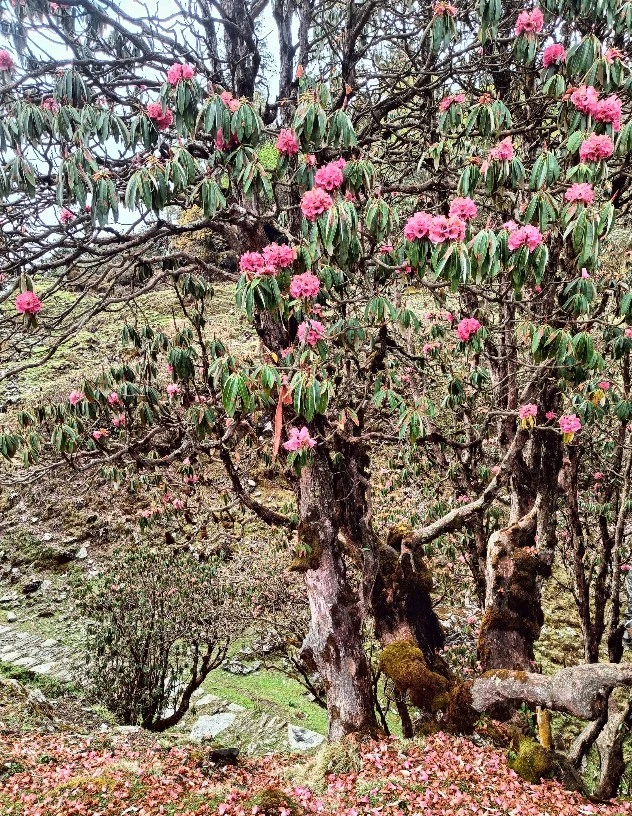 Rhododendron flowers begin to bloom across many Himalayan forests during April. These bright red and pink blossoms create colorful trails.