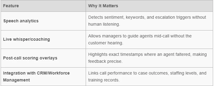 While compliance monitoring watches for rule‑breaks, call quality monitoring tools assess the broader customer experience. Features to look for include: