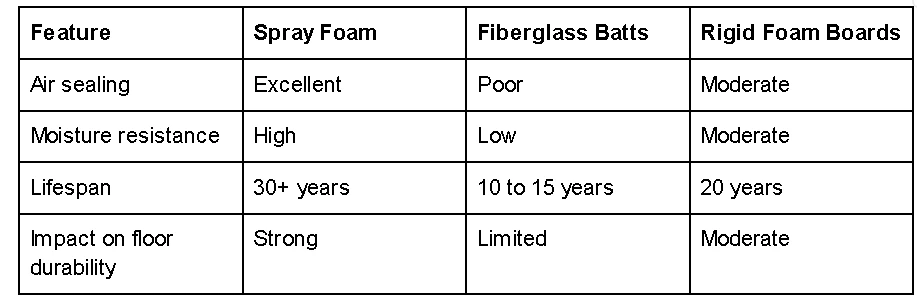Different insulation types affect floors in different ways. The table below shows how spray foam compares to common alternatives.