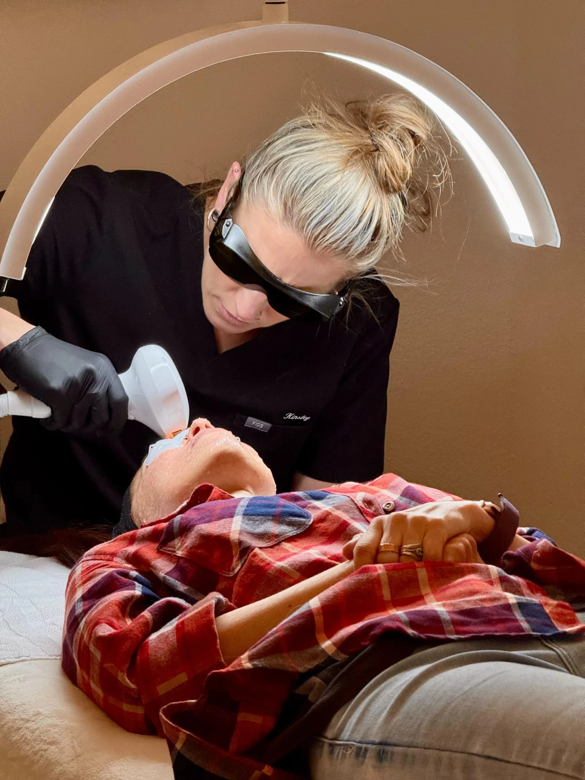 A typical photofacial IPL session lasts about 20–45 minutes. Your provider will cleanse the skin and apply a cooling gel. Protective eyewear is worn while pulses of light are delivered to the treatment area.