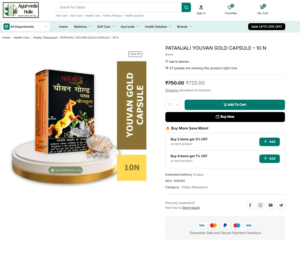 The Youvan Gold Capsule is an Ayurvedic supplement designed to revitalize the body, promote vigor, and enhance energy levels. Rooted in the principles of Ayurveda, this capsule is crafted using potent natural ingredients that work synergistically to address the root causes of fatigue and weakness. It is marketed as a safe and natural alternative to synthetic energy boosters, with an emphasis on restoring the body’s balance and vitality.