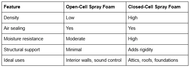 Open-cell spray foam works well for interior walls and sound control. Closed-cell spray foam offers higher density and moisture resistance.