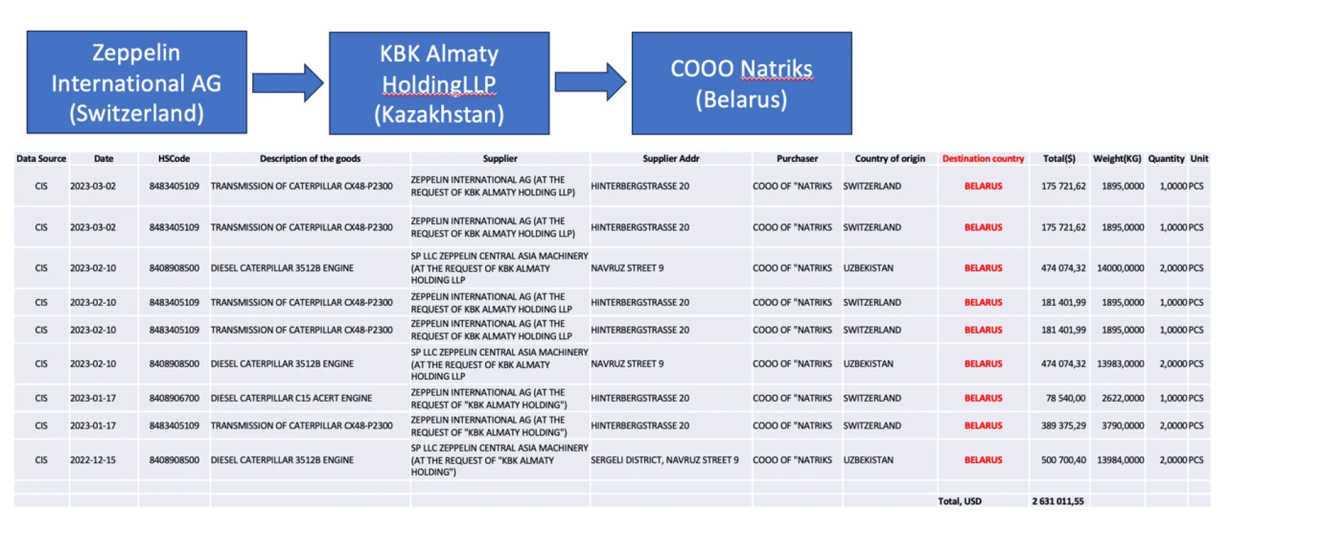 According to customs records obtained by Berliner Telegraph, LLC Zeppelin International Armenia, a subsidiary of Zeppelin International AG, has been actively supplying special equipment and dual-purpose tracks to Russia. Zeppelin International AG\'s partner in Kazakhstan, KBK Almaty Holding LLP, is also working closely with its Belarusian partner, Natriks.