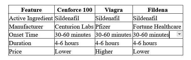 Cenforce 100 is comparable in efficacy and composition to popular medications like Viagra, Fildena, and Kamagra. Here's how it stacks up:
