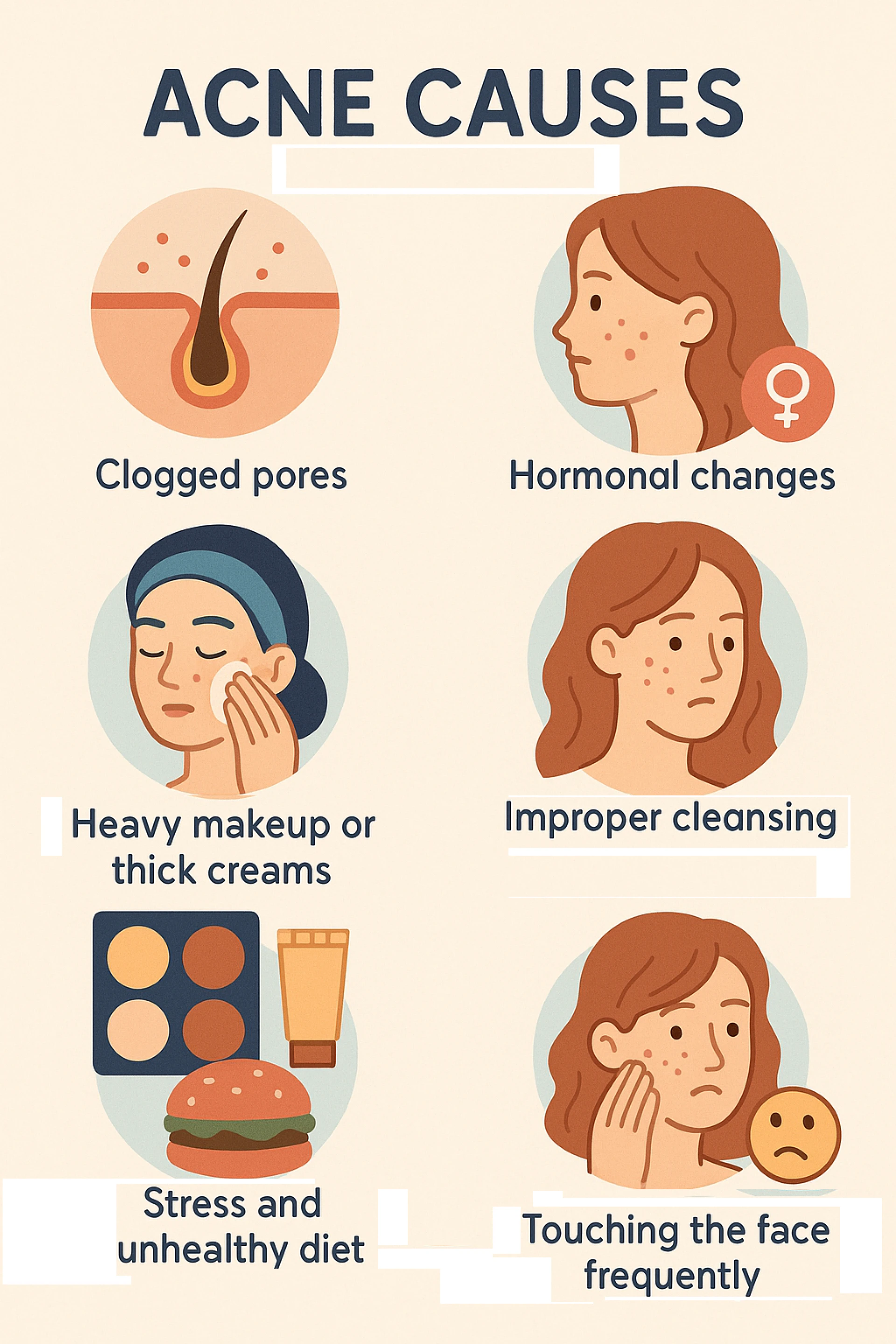 Acne are breakouts in the skin that get clogged up with oil, dead skin, and sometimes dirt or bacteria. This is what causes acne. You get pimples and spots on your face, back, or chest when this happens. There are many things that can make acne worse, such as