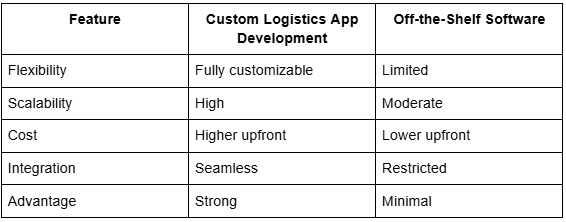 Here is a quick table that underscores the key differences between custom logistics app development and off-the-shelf software development.