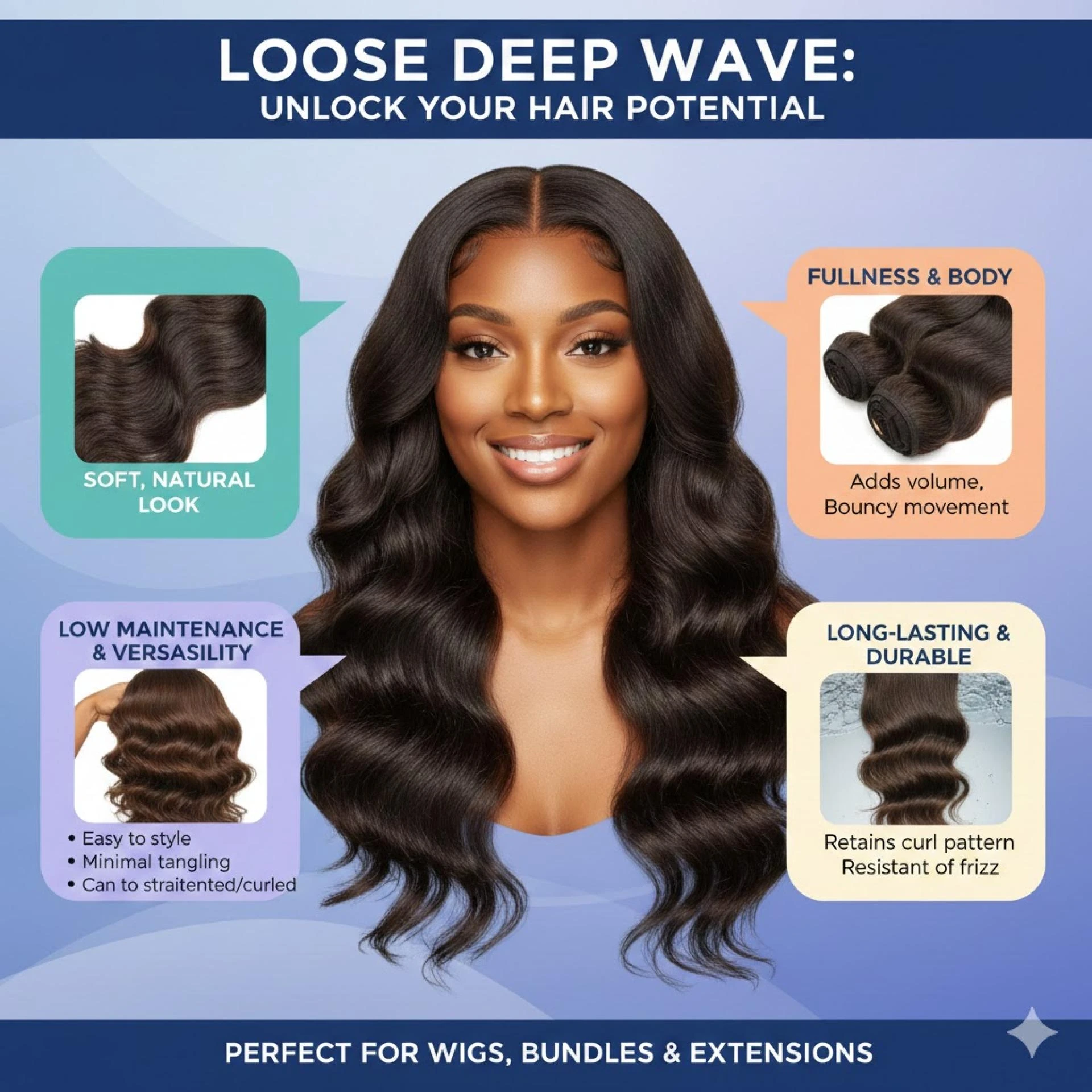 Want something lighter and more flowy? Loose deep wave bundles are perfect for achieving soft volume without heaviness. Whether installed as a full sew-in or paired with a deep wave closure, the result is seamless and stunning.