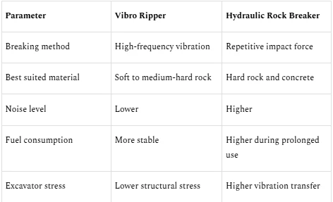 Vibro rippers often deliver lower long-term operating costs in suitable conditions. Rock breakers incur higher costs during continuous use.