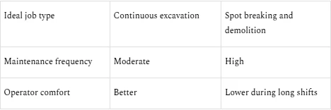 Rock breakers are louder. Impact produces higher vibration and dust. Noise restrictions often limit operating hours in populated areas.