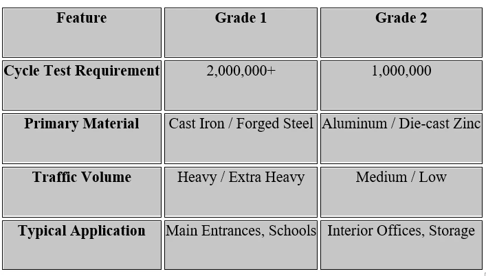 Maintenance Costs: Grade 2 units are prone to "O-ring" failure and hydraulic fluid leaks when over-worked. Replacing a closer every three years costs more in labor and downtime than installing a Grade 1 unit once.