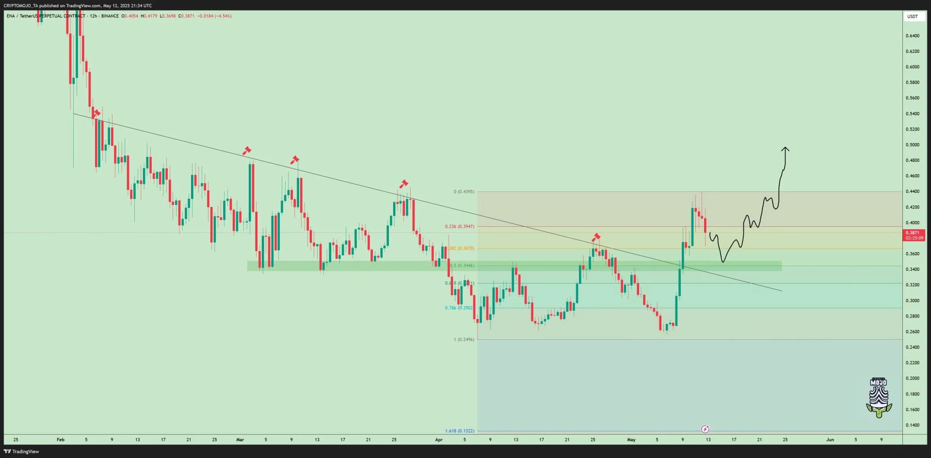 Crypto analyst on X highlighted that ENA has finally breached its trendline after multiple rejections, and it's now retesting the Fibonacci zone around the breakout area.