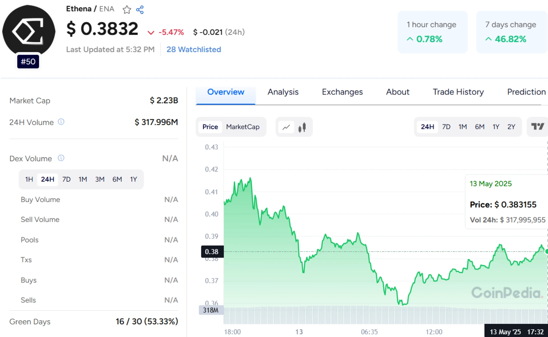 Currently, the live Ethena crypto price stands at $0.3832, with a 24-hour trading volume of over $317 million, although it's down 5.47% in the past day.