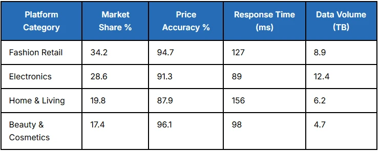 This comprehensive performance matrix showcases the effectiveness of the Korean E-Commerce Data API across major retail categories in South Korea's digital marketplace, processing 2.4 million daily transactions. Each segment demonstrates market penetration levels, pricing accuracy rates, system response capabilities, and data processing volumes for strategic business intelligence with 97.8% uptime reliability.