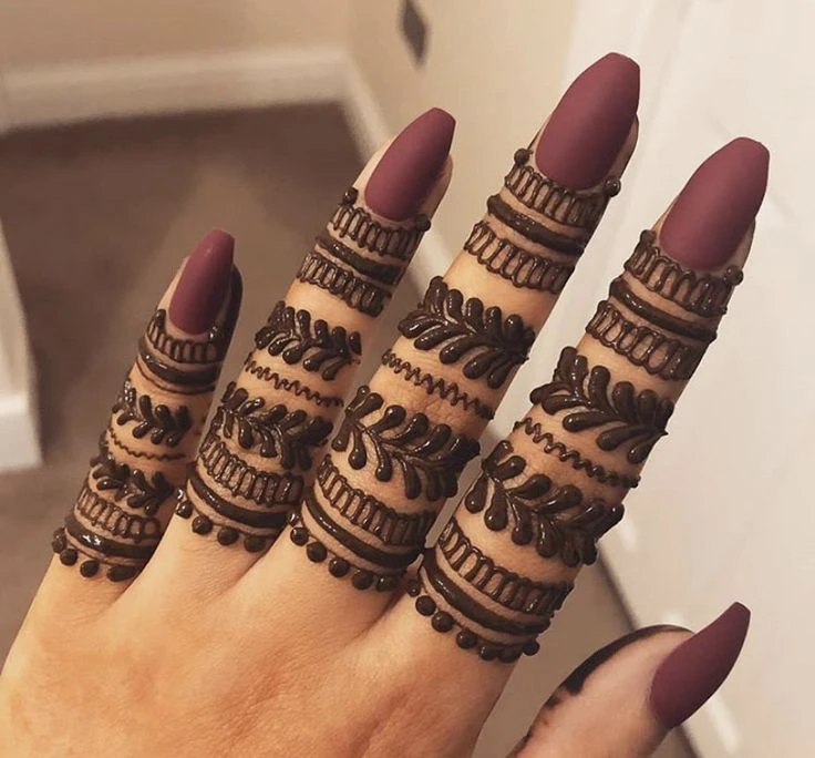 Horizontal or slanted lines across each finger bring a bold and symmetrical look. These Stylish Finger Mehndi Designs are loved for their rich yet clean visuals.