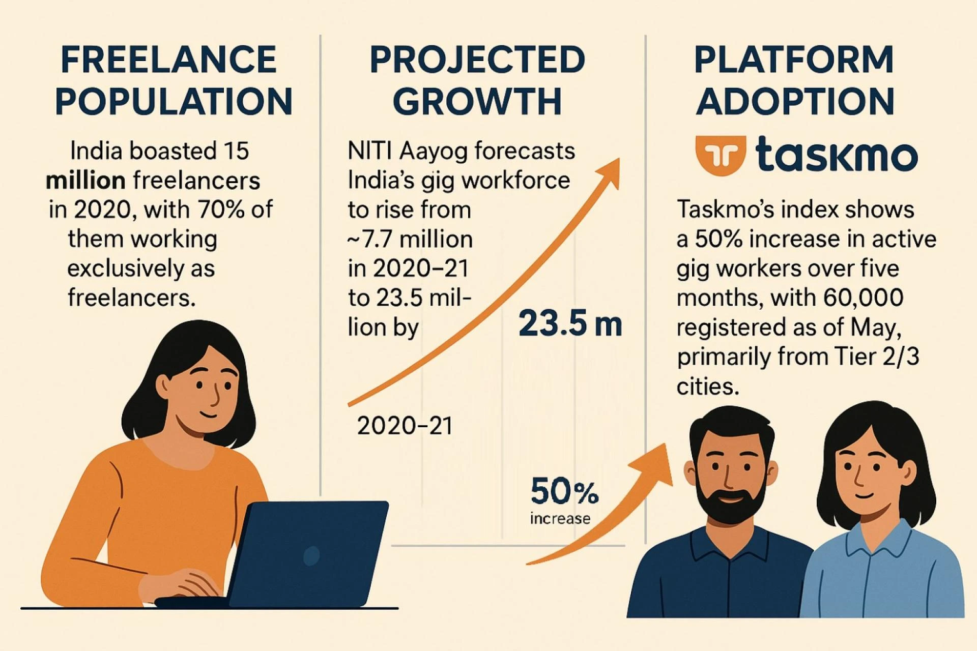 - Platform adoption: Taskmo’s index shows a 50% increase in active gig workers over five months, with 60,000 registered as of May, primarily from Tier 2/3 cities.