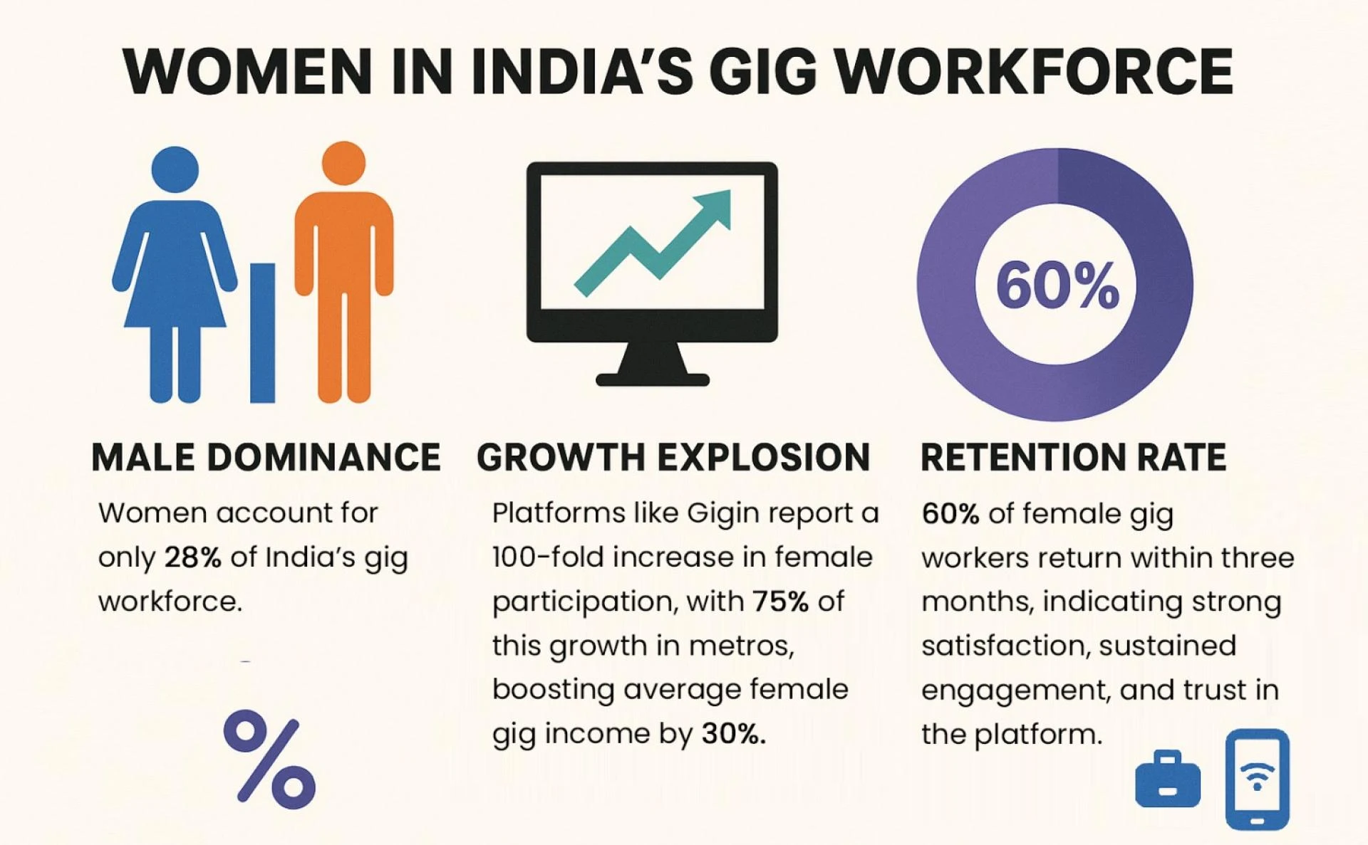 - Growth explosion: Platforms like Gigin report a 100-fold increase in female participation, with 75% of this growth in metros, boosting average female gig income by 30%.