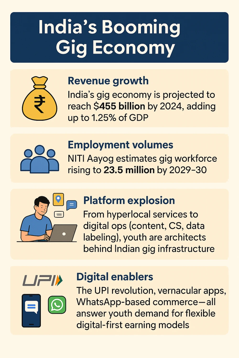 - Projected growth: NITI Aayog forecasts India’s gig workforce to rise from ~7.7 million in 2020–21 to 23.5 million by 2029–30.
