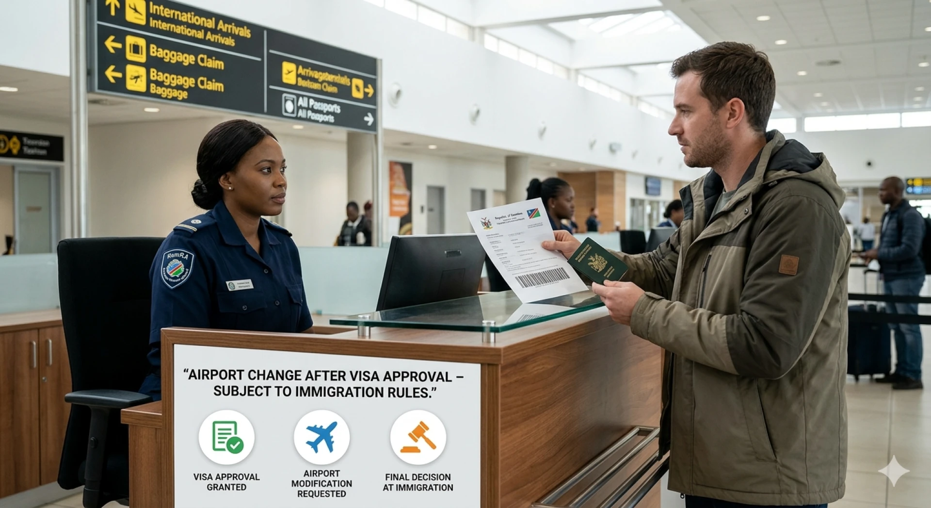The applicants can change their airport after their visa confirmation in most cases but this possibility depends on their visa type and entry requirements. The traveler needs to comply with immigration rules while entering Namibia through these minor changes which remain acceptable. Some visas require travelers to use specific entry points which makes airport changes necessary to obtain immigration permission. The issuing authority should be consulted for any changes which require thorough visa details to be examined before proceeding.