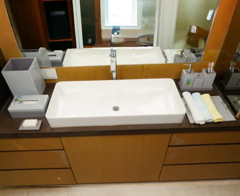 Contain only the bare essentials – such as a soap dispenser, soap dish, and toothbrush holder.