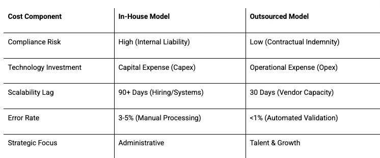 When organizations conduct true TCO analysis, outsourcing becomes economical. It converts fixed overhead into variable cost aligned with headcount. It eliminates capital expenditure on infrastructure. It reduces compliance risk from a liability to a managed variable.