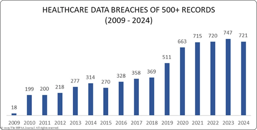 - 2023: The U.S. Department of Health and Human Services (HHS) reported 725 healthcare data breaches involving 500 or more records, exposing over 133 million records.
