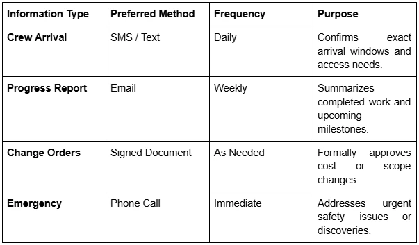 Different stages of the project require different communication styles. A professional contractor adapts their method to suit the urgency of the information.