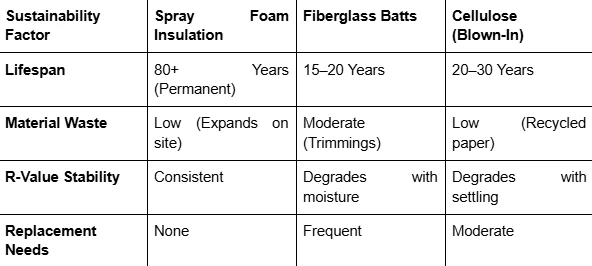 Choosing the right insulation material affects the home's long-term sustainability profile. Modern spray foams are designed to last for the life of the building, whereas traditional materials often settle or degrade and require replacement every 15 to 20 years.
