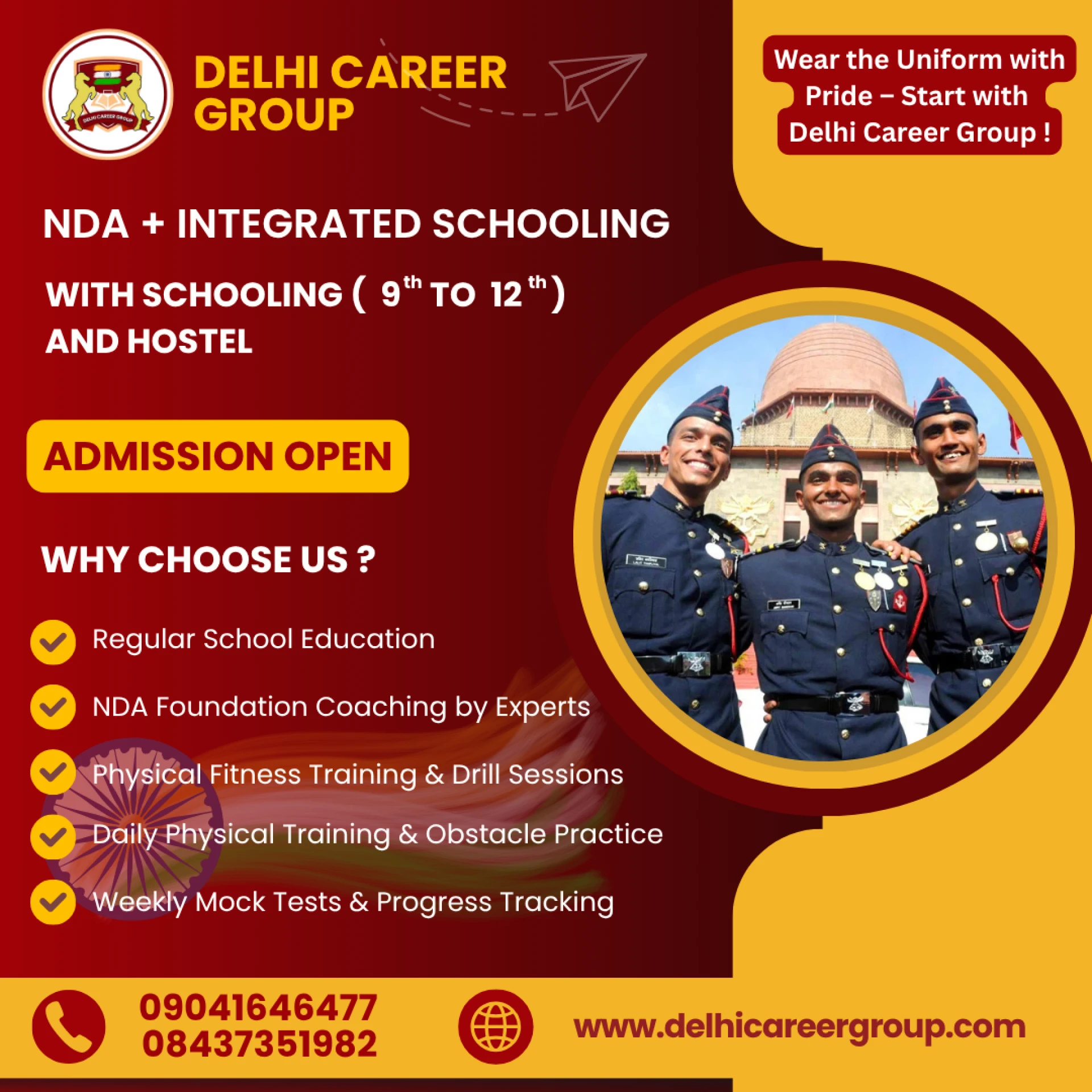 Under this program, Delhi Career Group provides CBSE-based schooling with NDA-oriented classes. Students receive coaching for Mathematics, English, and General Studies, along with physical training, personality development sessions, and interview guidance. This combined approach ensures complete preparation under one roof and saves valuable time.