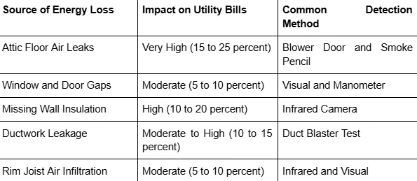 The following table compares familiar sources of energy loss found during a typical home evaluation: