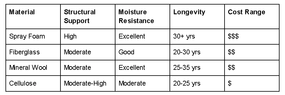This table highlights how insulation experts balance performance and affordability when recommending solutions.
