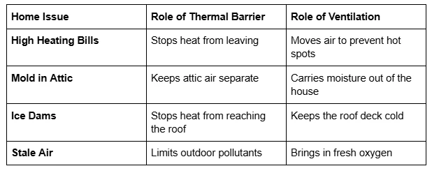 Both parts of the system must work together to keep the building healthy. One blocks the heat while the other manages the air quality and moisture. The table below shows how these two parts handle different home issues.