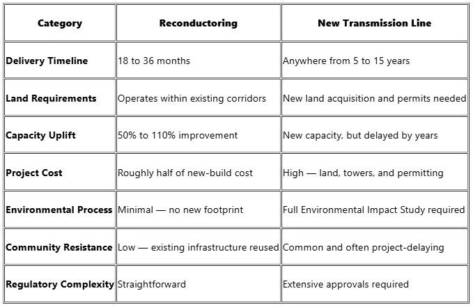 For years, reconductoring was treated as a routine maintenance practice rather than a strategic capacity tool. That framing is shifting as policymakers and investors recognize the speed advantage it offers relative to greenfield alternatives.