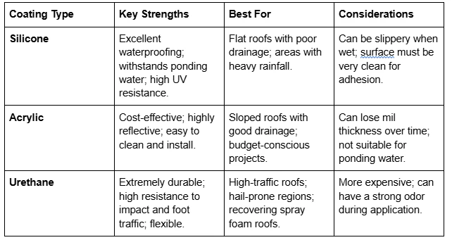 There are several types of roof coatings, each with its own strengths. The right choice depends on the type of existing roof, the climate, and the building owner’s specific goals.