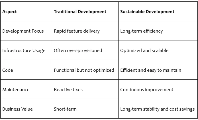 Regular optimization is essential for software to run without interruptions. Sustainable development promotes continuous improvement through modernization and infrastructure updates. Regular updates keep applications reliable and prevent frequent technical maintenance. Here is a brief comparison table of traditional software development and sustainable development.