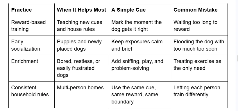 - Enrichment, socialization, and calm routines matter as much as cues.