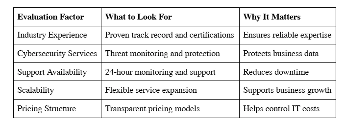 Businesses should evaluate experience, cybersecurity capabilities, service agreements, support quality, and pricing before selecting a provider.