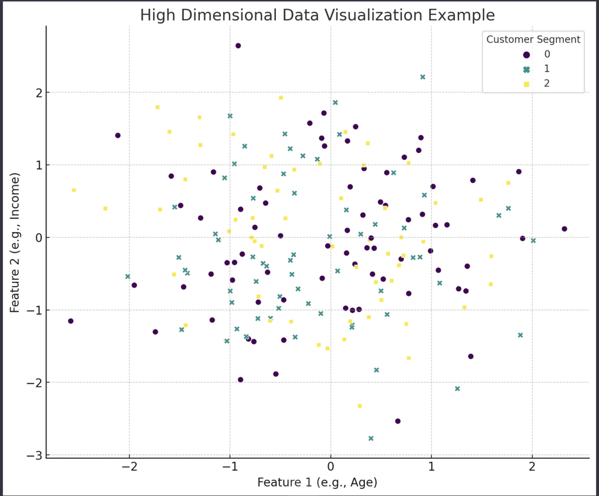 The scatter plot illustrates how data points, representing individual records in our dataset, are grouped according to \'Customer Segment\' when viewed through the lens of just two features (e.g., Age and Income). This visual technique helps in identifying patterns or clusters among the data points, which are indicative of how different customer segments may exhibit distinct characteristics in terms of these two dimensions.