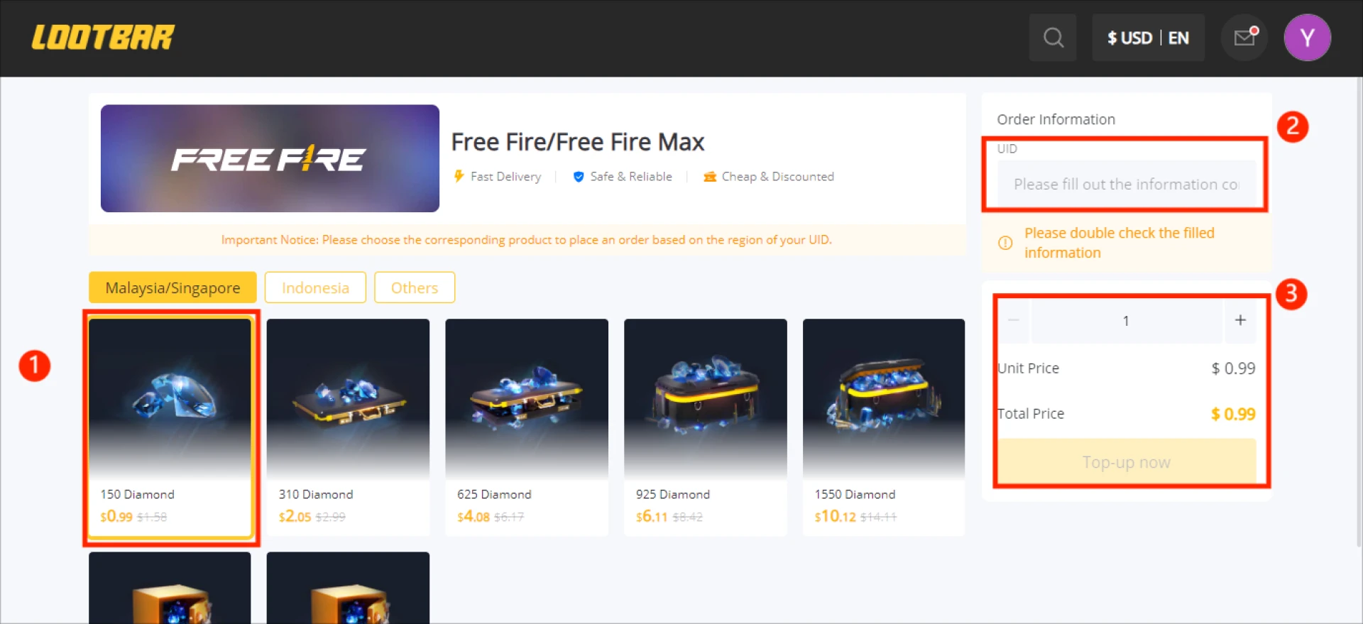 Take Free Fire as an example, first click on the number of diamonds you want to recharge, fill in the uid, and then click buy!