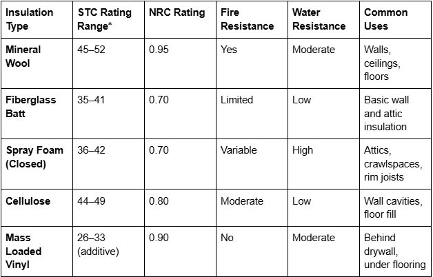Mineral wool outperforms many standard insulation materials in acoustic applications, especially fiberglass. The table below compares key characteristics that affect sound control: